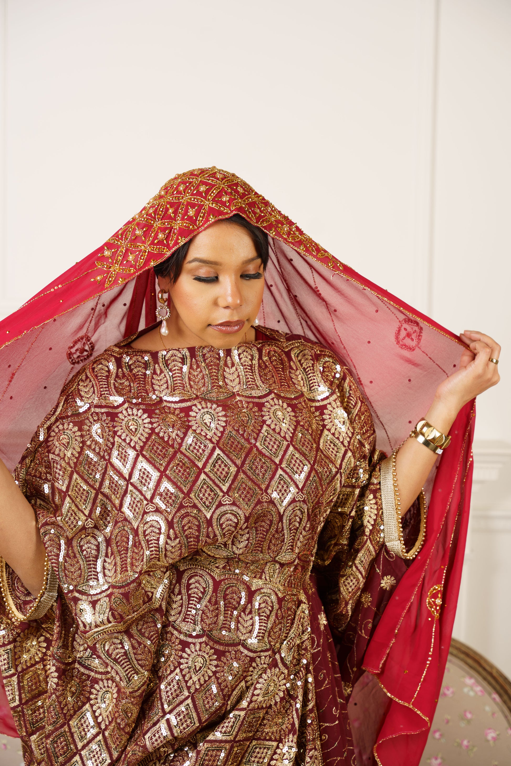 This luxurious chiffon hijab is designed to elevate any occasion look. Crafted in a rich tone colour, it features delicate gold embroidery with scattered sequin detailing that catches the light beautifully without feeling heavy.