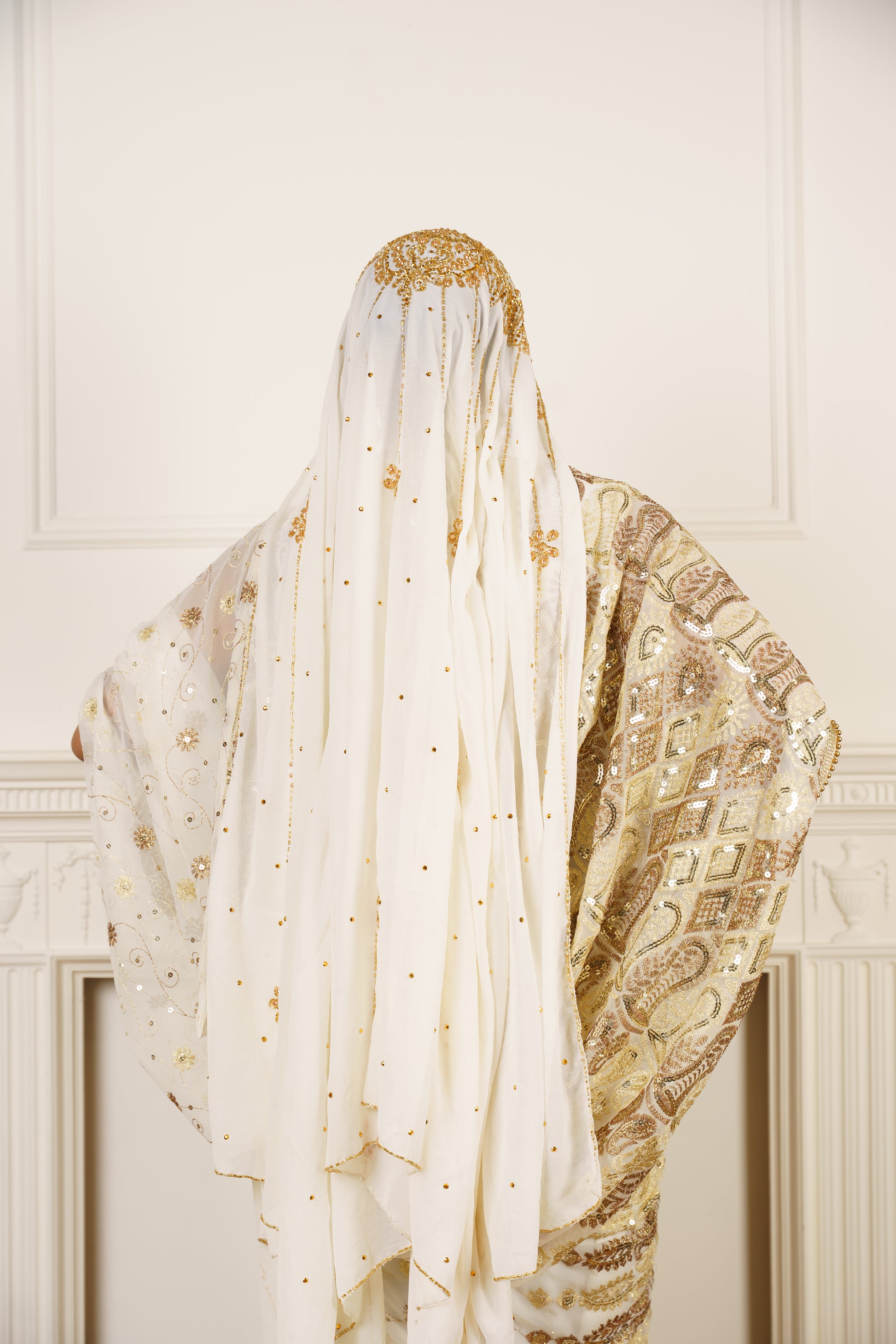 Lightweight and breathable, the fabric drapes effortlessly, making it ideal for long events, weddings, and formal gatherings. The fine gold floral motifs and subtle diagonal detailing add depth and sophistication, giving the hijab a refined, graceful finish.