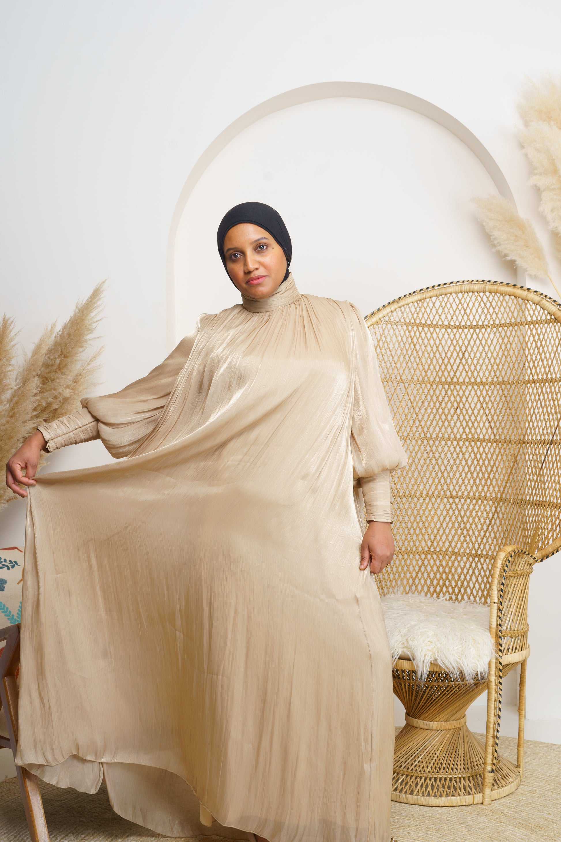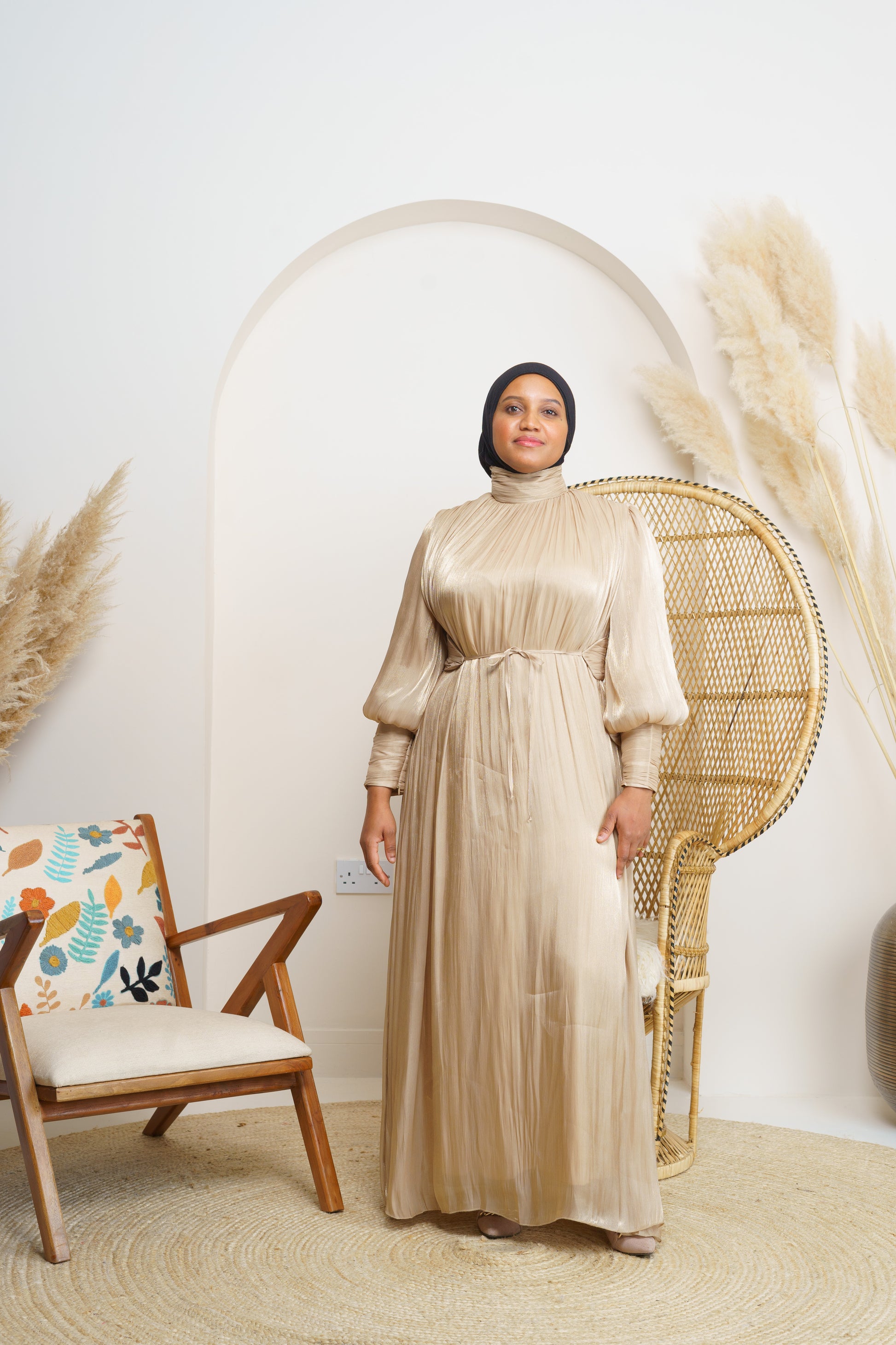 A stunning organza dress that shimmers and shines also features a high-necked collar with a sleek zipper at the back, adding ease and elegance to its fit. With chic zippered cuffs and a trendy balloon sleeve design, it combines style with functionality. The adjustable belt accentuates the waist, giving a flattering, tailored look that’s perfect for any occasion. You can style it with or without the belt.