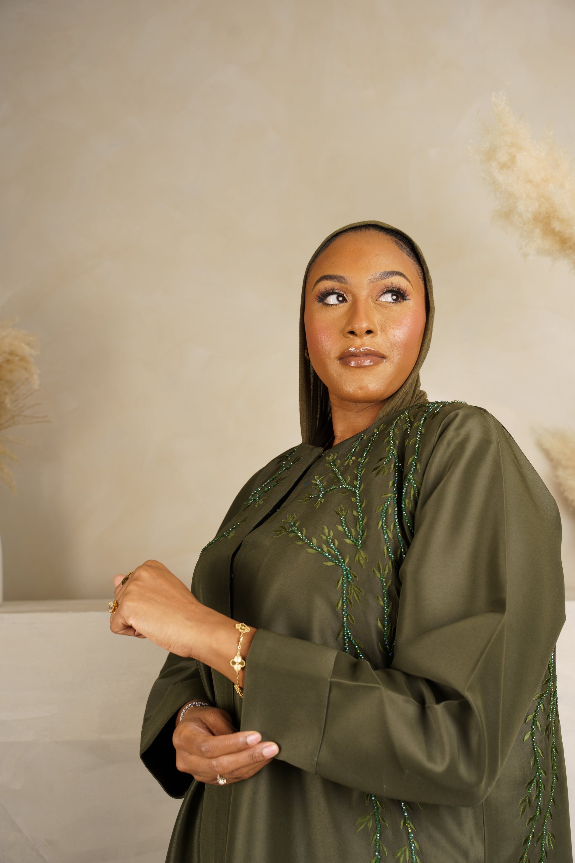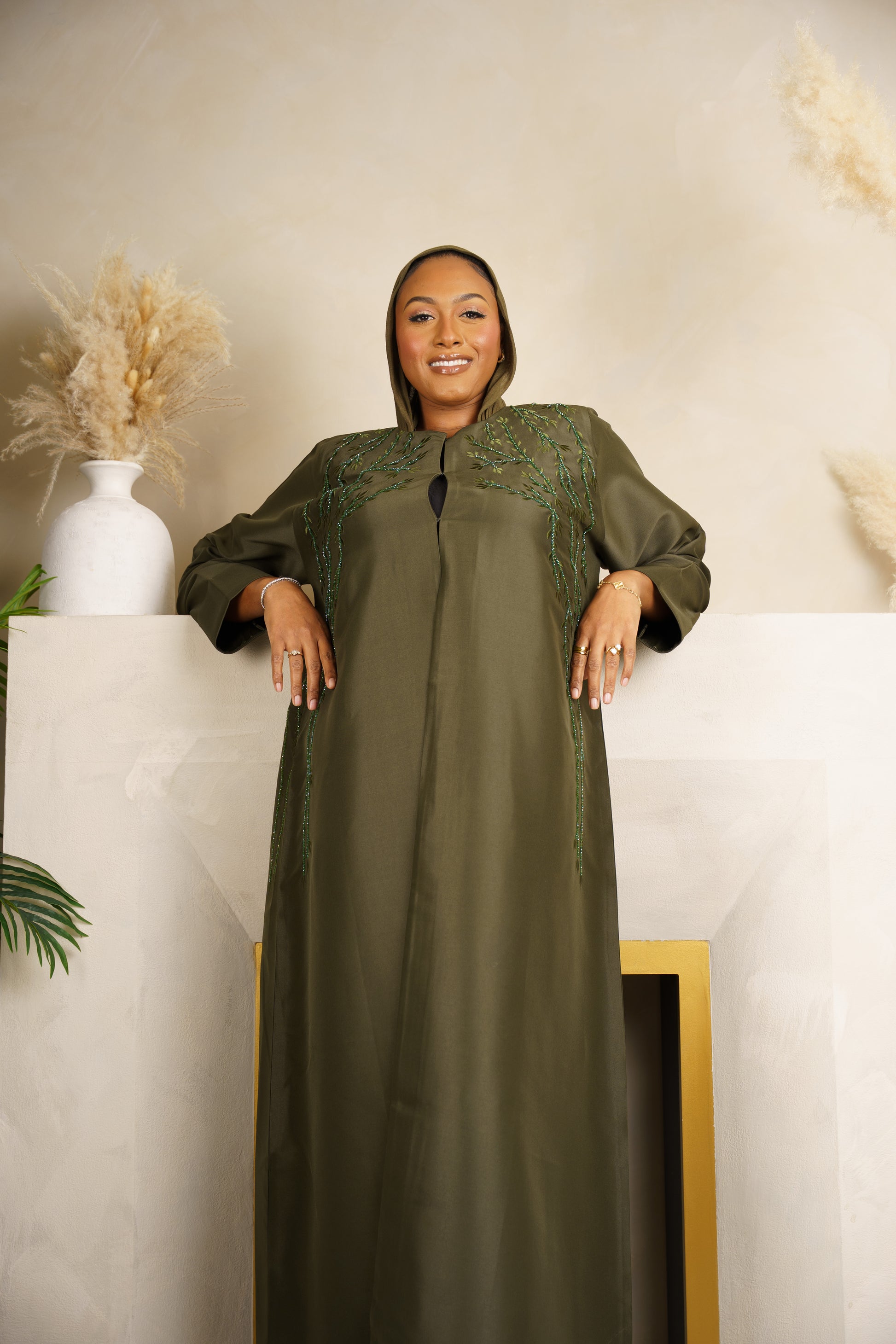 The rich olive hue complements all skin tones, while the modest silhouette ensures timeless sophistication.