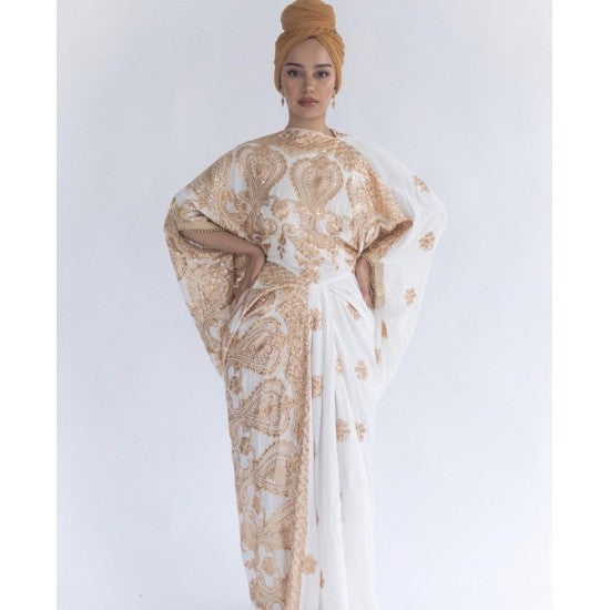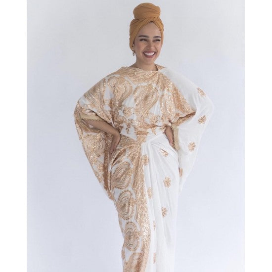 Saree Dress is so beautiful for all shades all sizes. It's a fully stitched saree made into a dress one size it has an inner belt to adjust your own size you can make it loose or tight however you want. Saree dress is perfect for everyone and all occasions. Why not rock it with a pair of high heels and glow